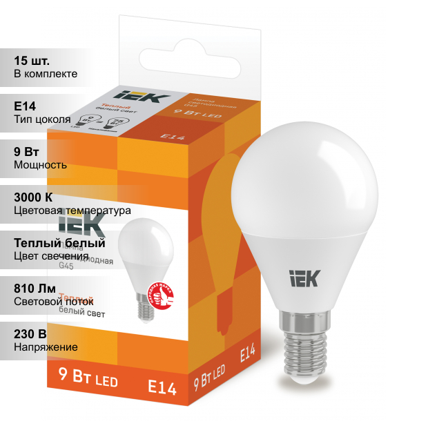 (15 шт.) Светодиодная лампочка IEK шар G45 E14 9W(810lm) 3000К 3K ECO LLE-G45-9-230-30-E14 . Цоколь E14