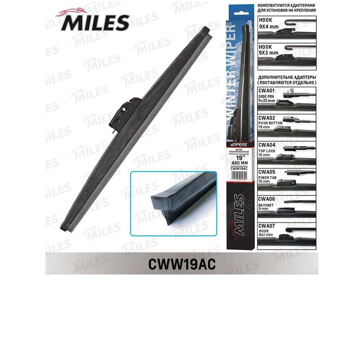 MILES CWW19AC Щетка с/о зимняя MILES 19/480mm в коробке + адаптер HOOK 9x3/9x4