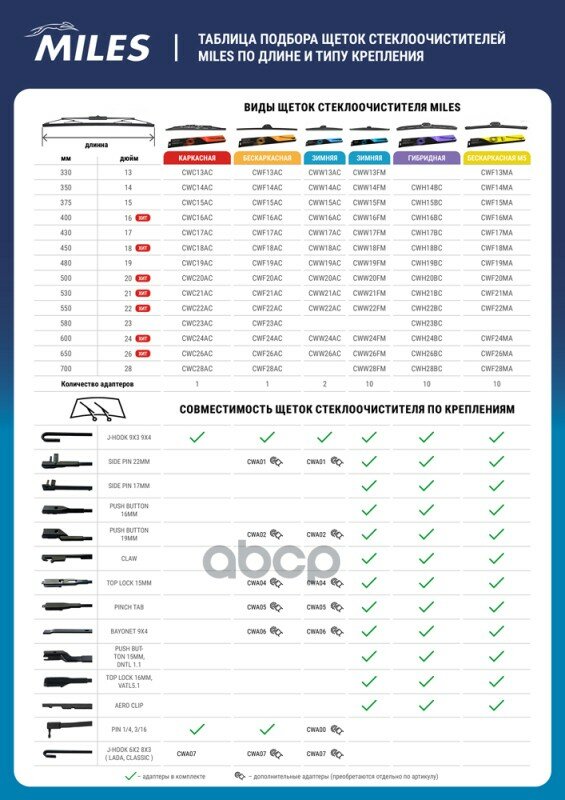 Щетка с / о зимняя MILES 19 / 480мм + адаптеры HOOK 9x3 / 9x4 CWW19AC MILES CWW19AC