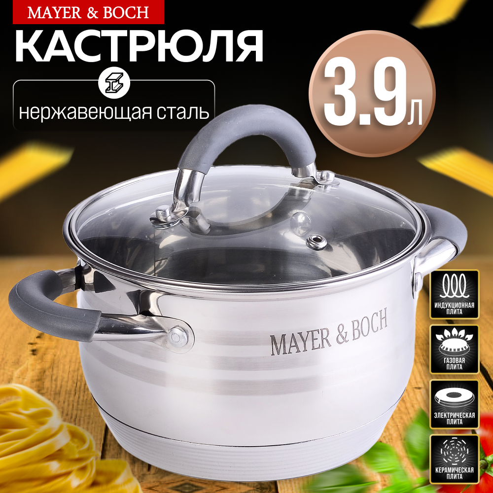 Купить Кастрюля нержавеющая сталь со стеклянной крышкой 3,9 л / для всех видов плит, в т.ч. для индукционных / Mayer&Boch