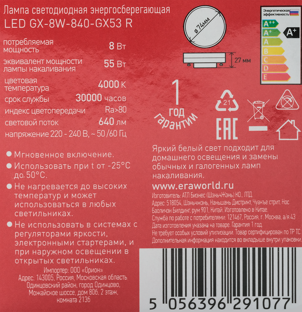 Купить Лампа светодиодная GX53 ЭРА Таблетка, 8Вт, 4000К, лампочка 1 шт. Б0052657
