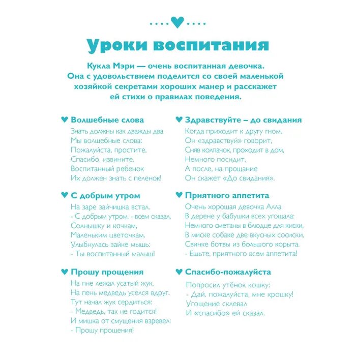 | Отзыв: | очень красивая,читает стихи и поёт,в комплекте маленький велюровый мишка,очень приятный на ощупь. |