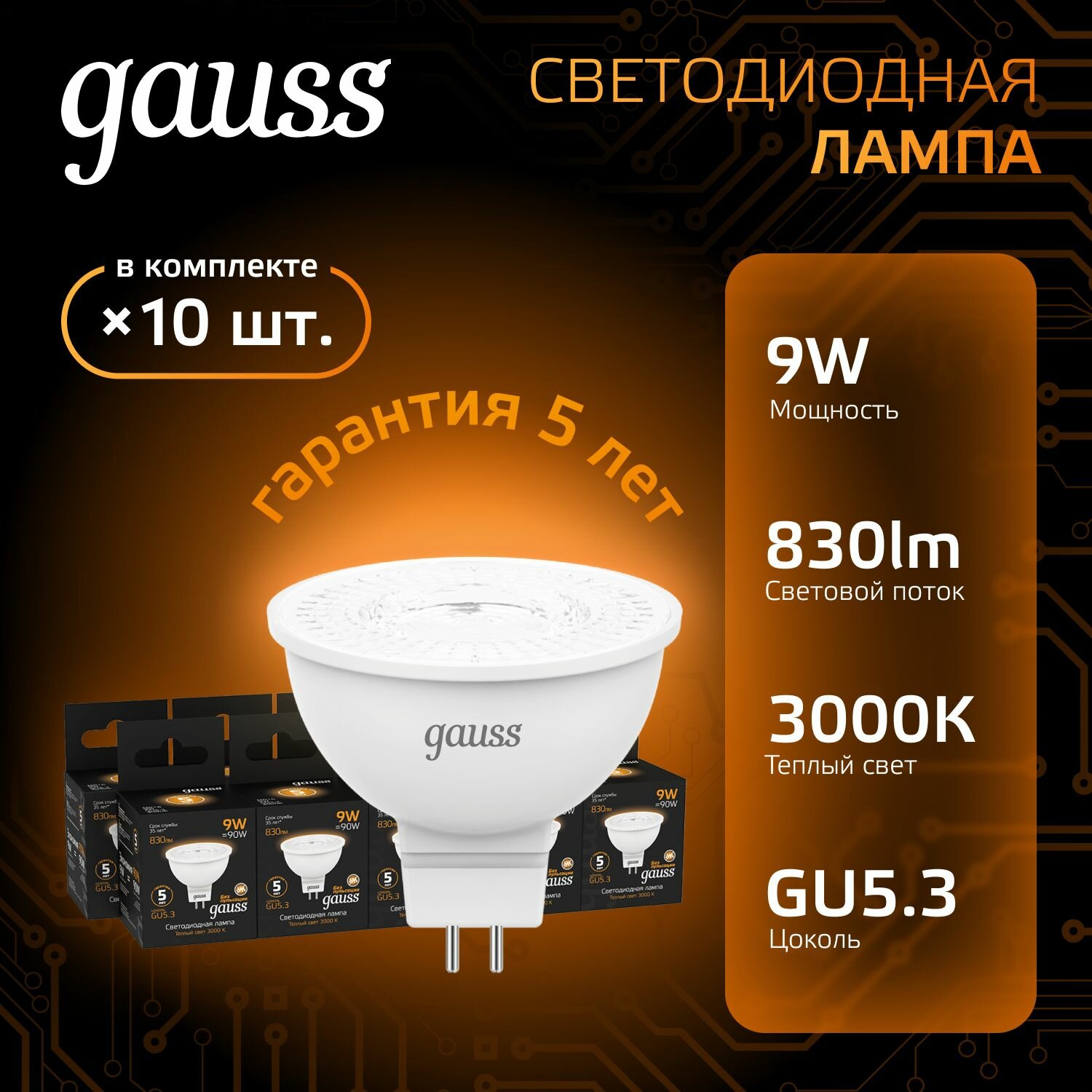 10шт. - Лампа светодиодная LED 9 Вт 830 лм 3000К AC150-265В GU5.3 софит MR16 теплая Black Gauss / GAUSS; арт. 101505109; оригинал / - комплект 10шт