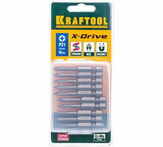 KRAFTOOL Биты "X-DRIVE" торсионные кованые, обточенные, KRAFTOOL 26123-1-50-10, Cr-Mo сталь, тип хвостовика E 1/4", PZ1, 50мм, 10шт, ( 26123-1-50-10 )