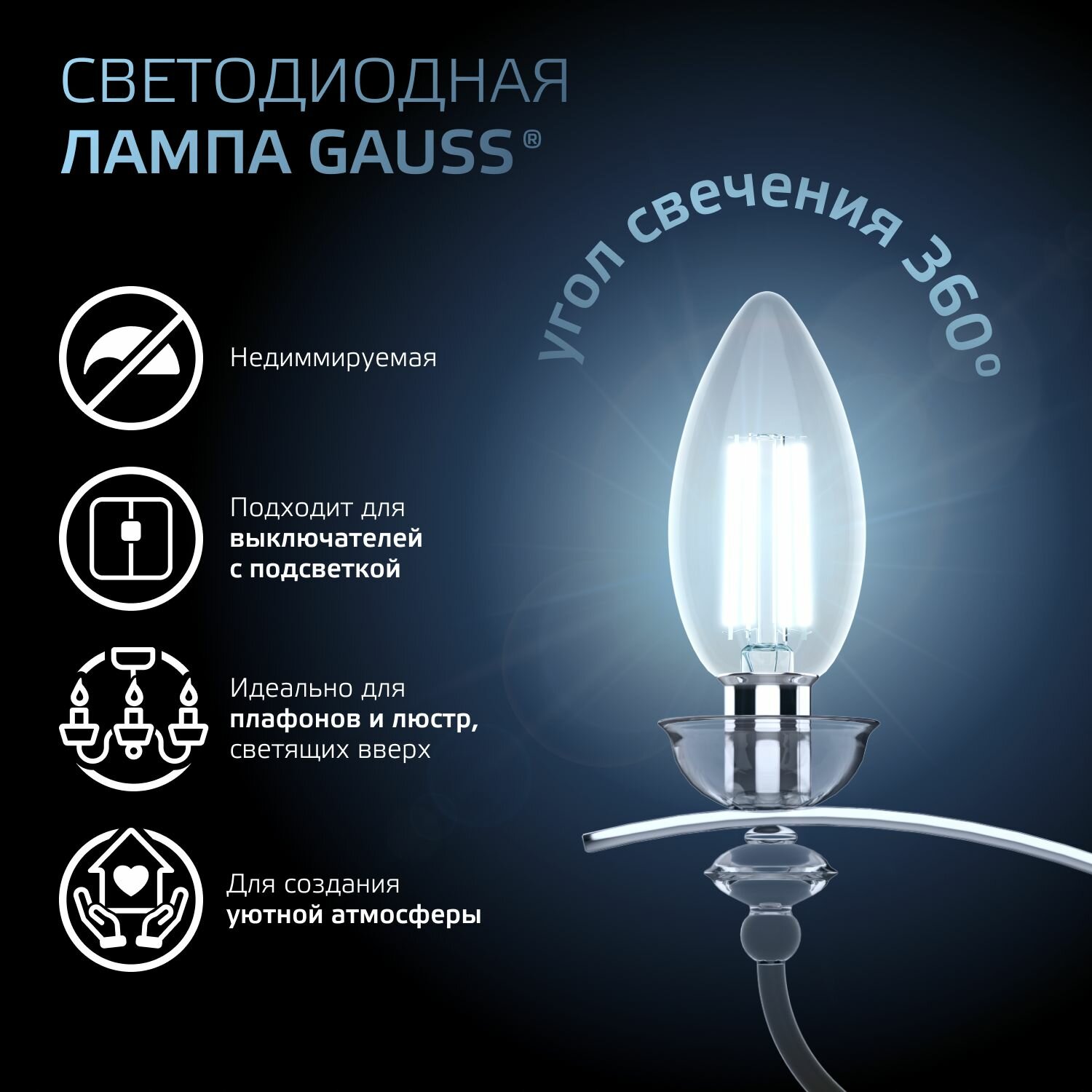 Лампа филам. Gauss 7Вт цок: E14 свеча 220B 2700K св. свеч. бел. теп. C37 (упак:10шт) (103801107)