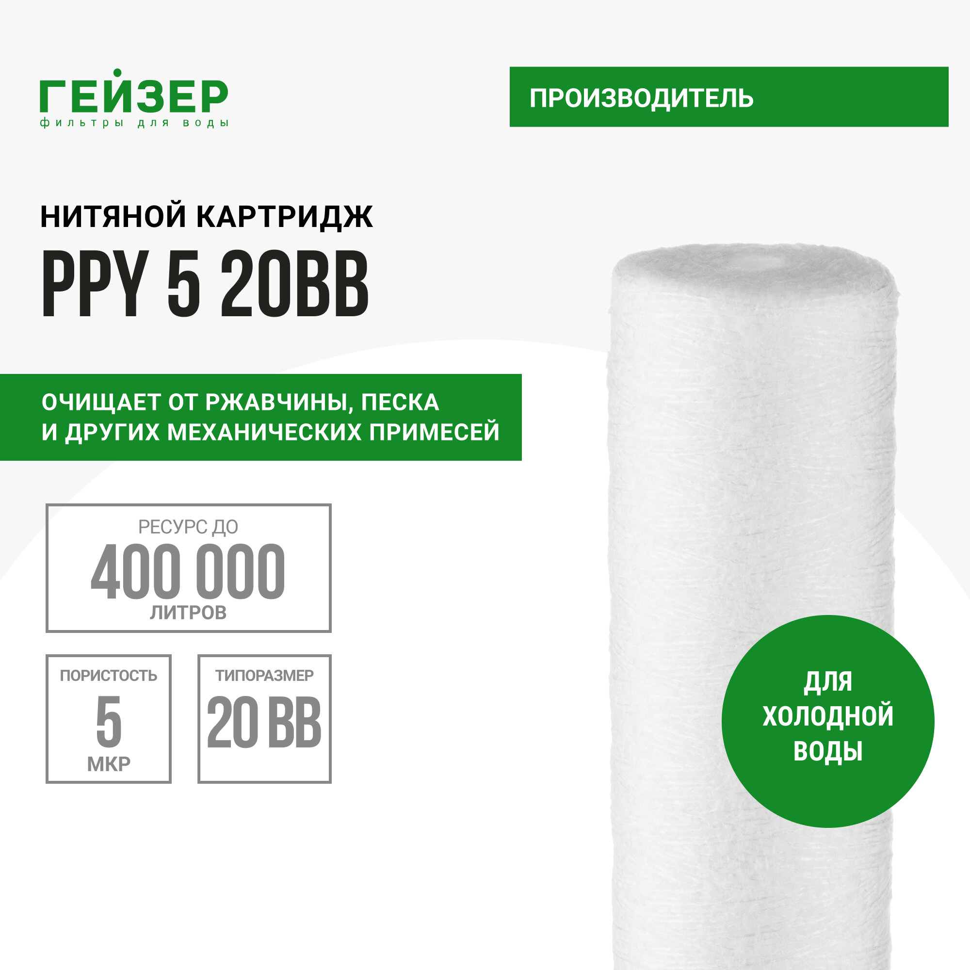 Полипропиленовый картридж механической очистки / полипропиленовая нить Гейзер PPY 5 для холодной воды - 20BB, 28051 - 1 шт.