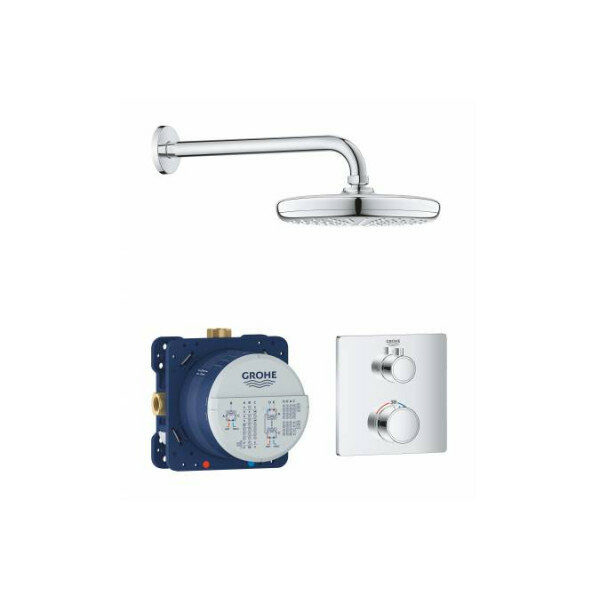 Набор для комплектации душа GROHE Grohtherm: встраиваемый термостатический смеситель с переключателем верхний-ручной душ, квадратная розетка, верхний душ Tempesta 210 с кронштейном, хром (34728000)