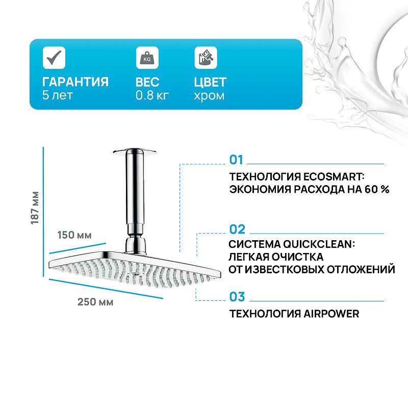 Верхний душ Hansgrohe PuraVida HG 27 383 000 250х150 мм, 1 режим, с потол. кр. 100 мм, 9 л/мин хром