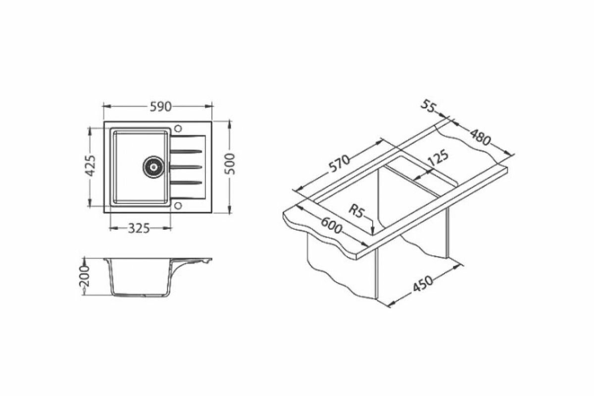 Кухонная мойка Alveus GRANITAL CADIT 10 CARBON G91 590 X 500 1X с сифоном 1132823 (1132021)