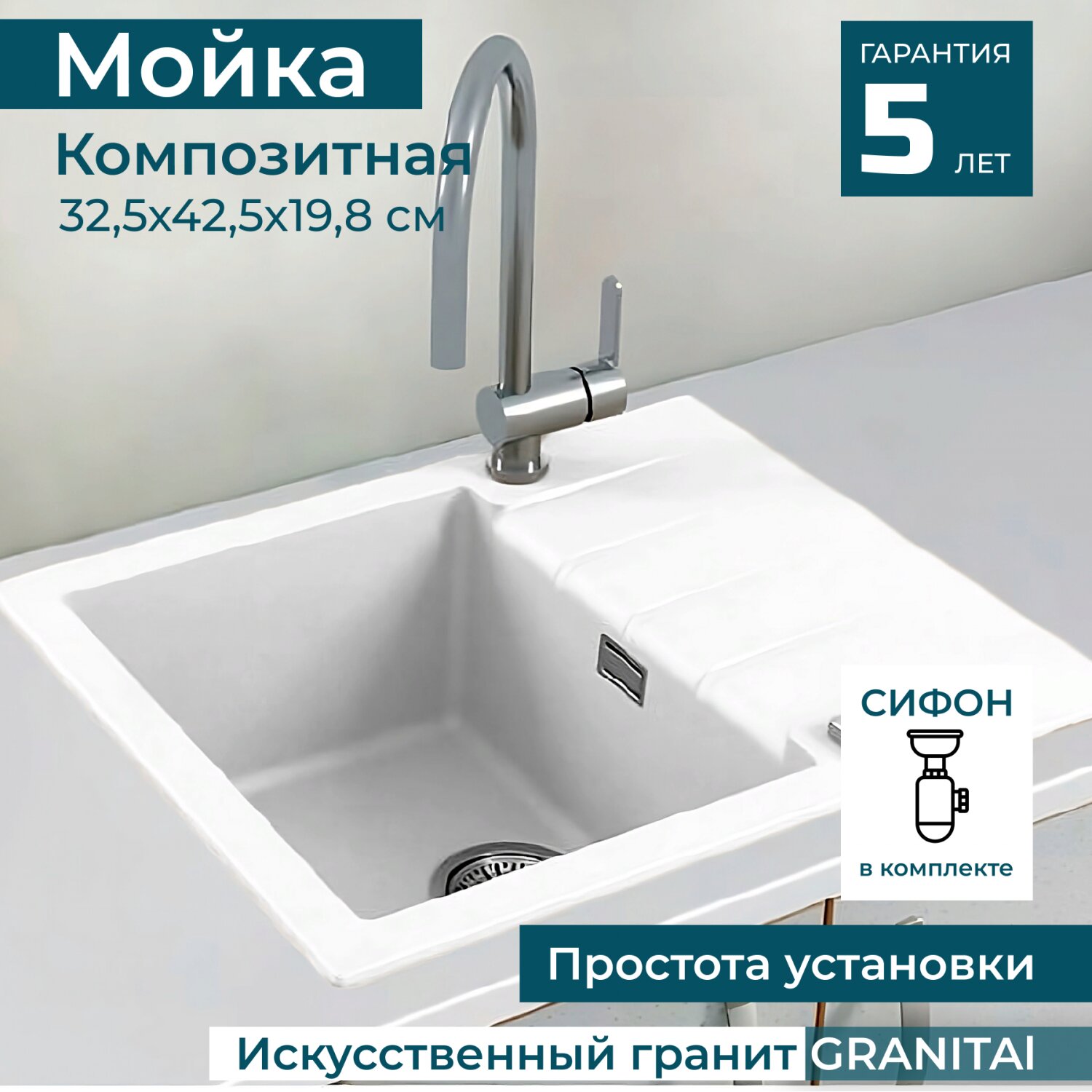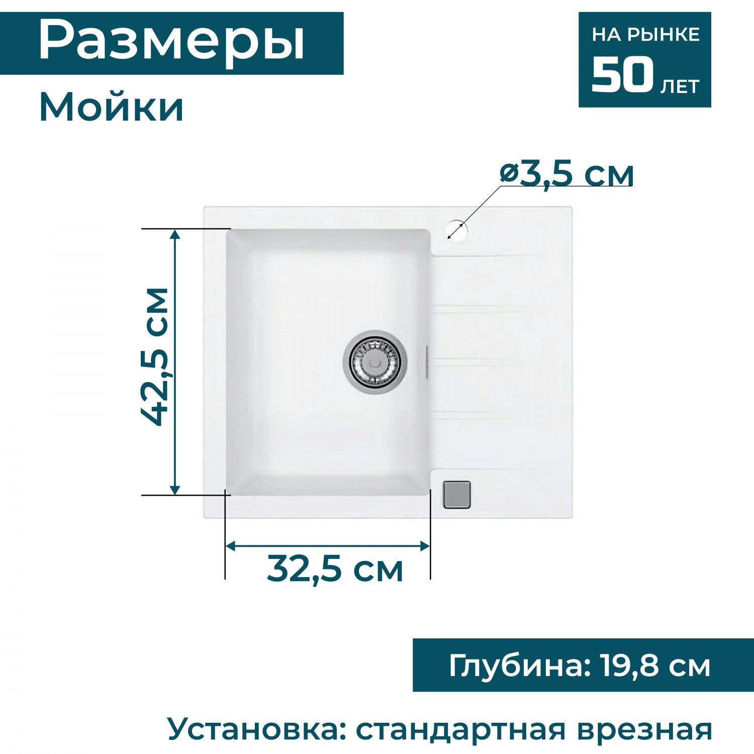 Мойка для кухни каменная врезная с крылом ALVEUS GRANITAL CADIT 10 - G11 59 X 50 см искусственный камень гранит с сифоном. Цвет белый