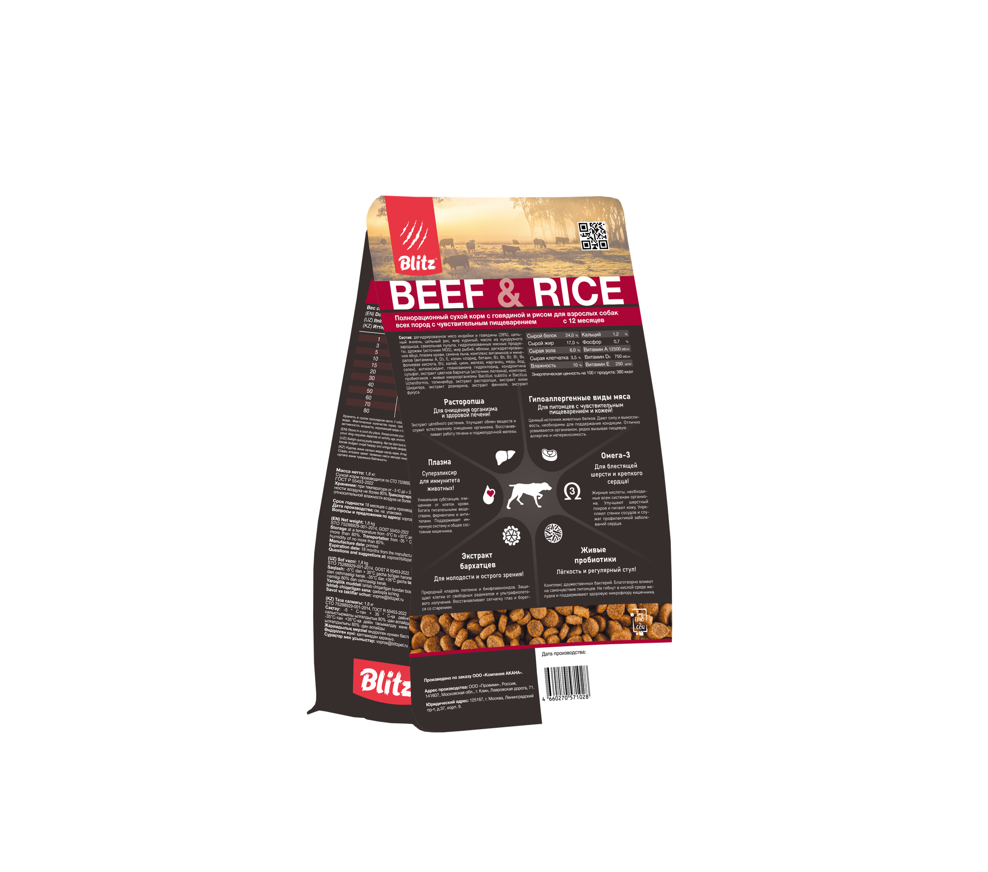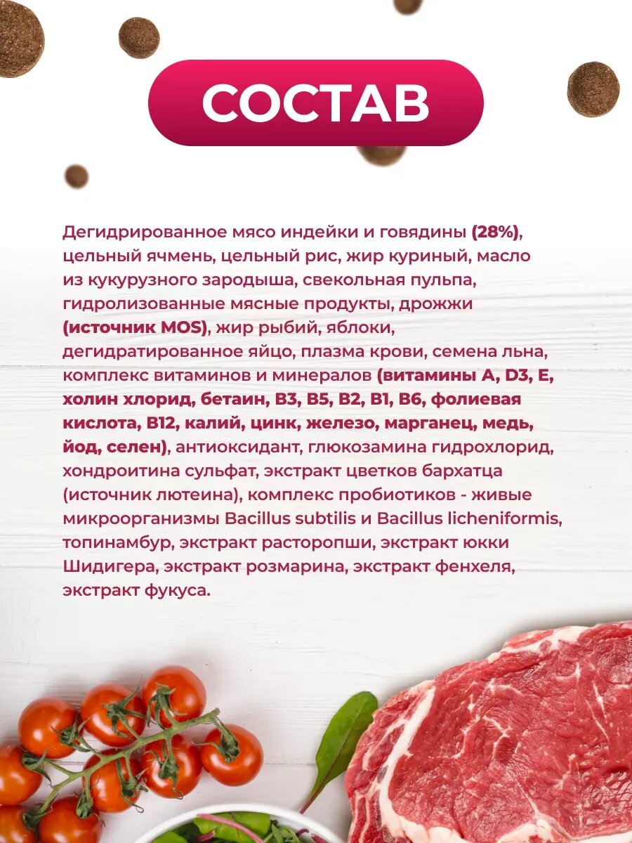 | Состав | дегидрированная индейка и говядина (28%), цельный ячмень, цельный рис, куриный жир, сушёная мякоть свеклы, витаминно-минеральный комплекс (витамины А, Д3, Е, холин хлорид, бетаин, В3, В5, В2, В1, В6, фолиевая кислота, В12, калий, цинк, железо, марганец, медь, йод, селен), гидролизованные субпродукты, дегидрированное яйцо, рыбий жир, дрожжи — источник маннаноолигосахаридов MOS, сушёные яблоки, семена льна, топинамбур — источник фруктоолигосахаридов (FOS), антиоксидант, глюкозамина гидрохлорид, хондроитина сульфат, пробиотик — живые микроорганизмы Bacillus subtilis и Bacillus licheniformis, экстракт розмарина, экстракт фенхеля, экстракт фукуса, экстракт юкки Шидигера |