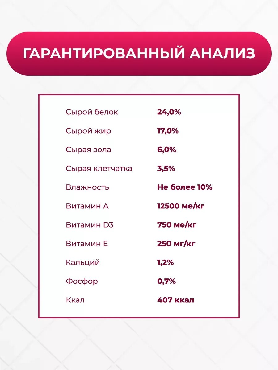 | Витамины | A - 12600 МЕ/кг, D3 - 1200 МЕ/кг, E - 120 мг/кг |