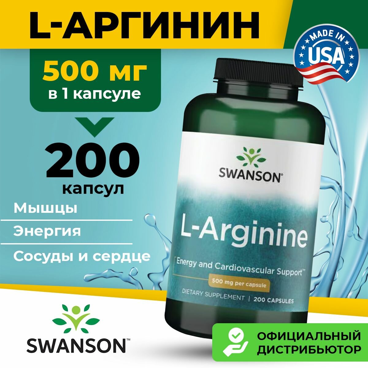 Swanson L-Arginine, Аргинин, 500мг 200 капсул, Спортивное питание, для энергии, для сердца и сосудов, поддерживает нормальное кровяное давление