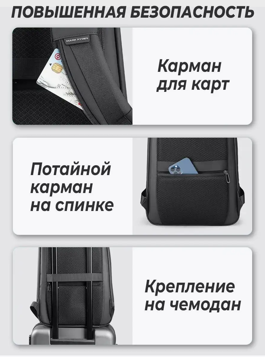 Рюкзак мужской Mark Ryden MR9008SJ 20л, с USB зарядкой, водонепроницаемый, черный
