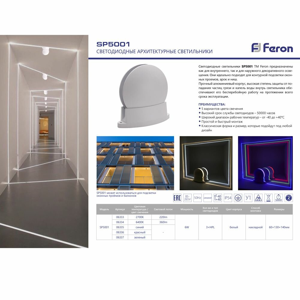 Уличный настенный светодиодный светильник Feron SP5001 06337, цвет Белый/Белый, материал Алюминий/Алюминий/Свет свечения зеленый