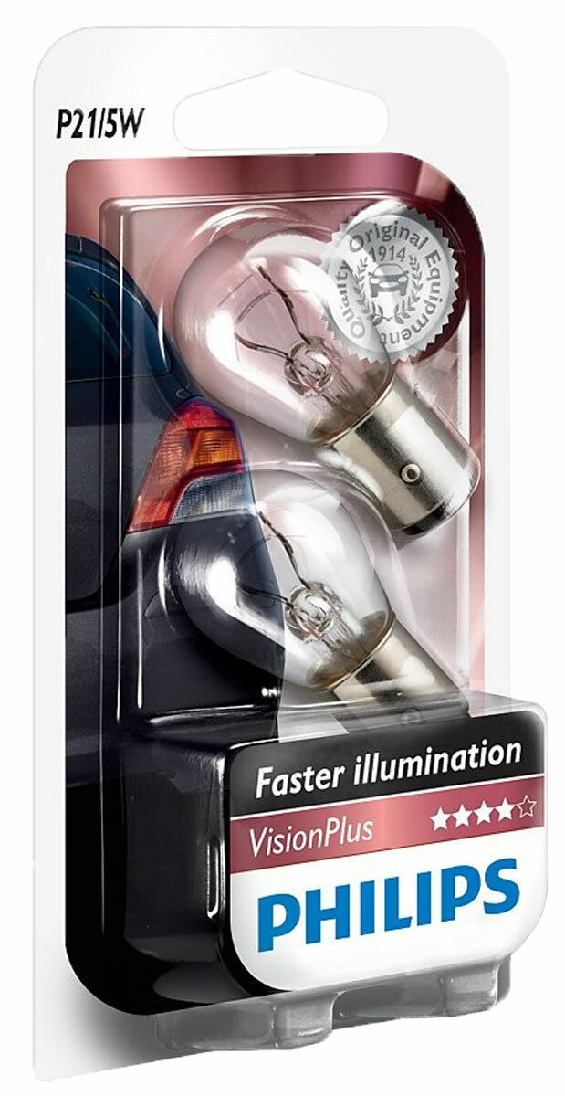 Комплект ламп накаливания блистер 2шт P21/5W 12V 21/5W BAY15D VISIONPLUS (На 60% больше света на дороге, стоп-сигналы видно раньше из-за более мощног PHILIPS 12499VPB2