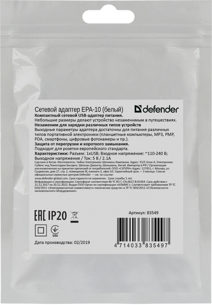 Defender UPA-21 White (83571) Зарядное устройство USB (Вх. Ac100-240v, Вых. Dc5v, USB 2.1A)
