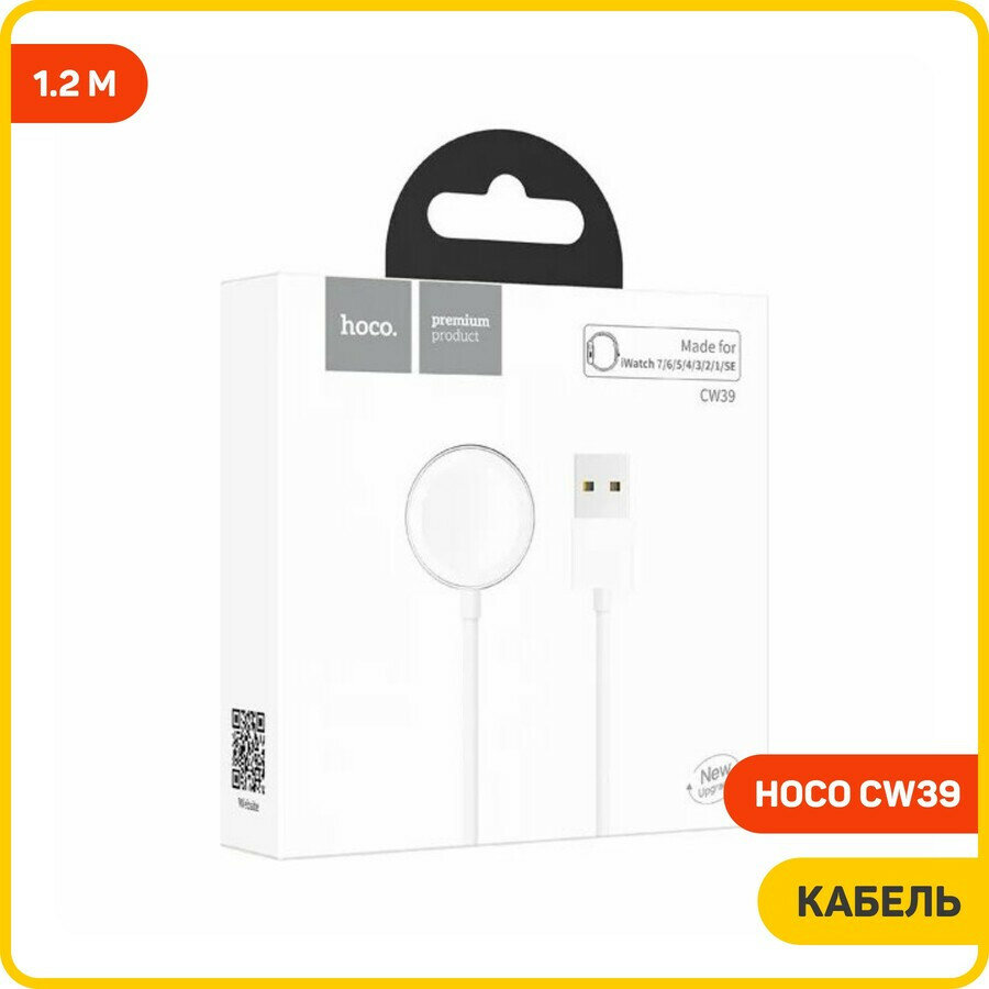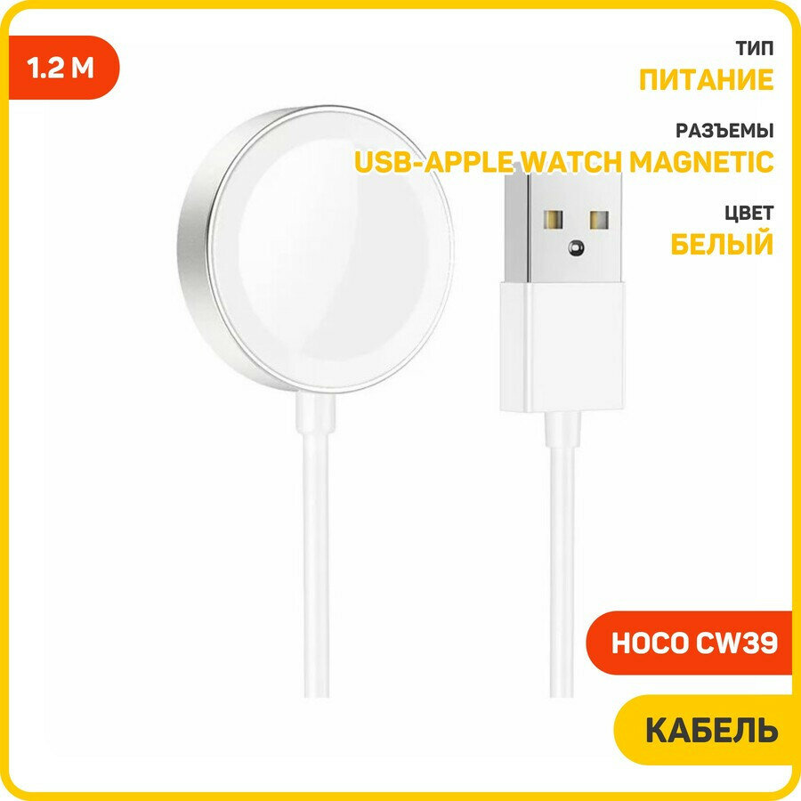 Беспроводная зарядка для Apple Watch series 1-7/SE, Hoco CW39 c кабелем USB-A, 1.2 м, Белый