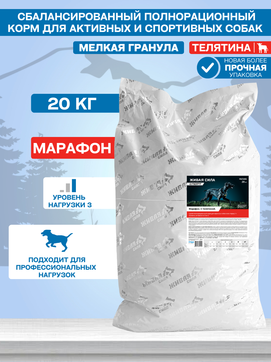 Живая сила Спорт, Марафон корм для собак всех пород с высокими нагрузками с телятиной и лососем, Крупная гранула (20 кг)
