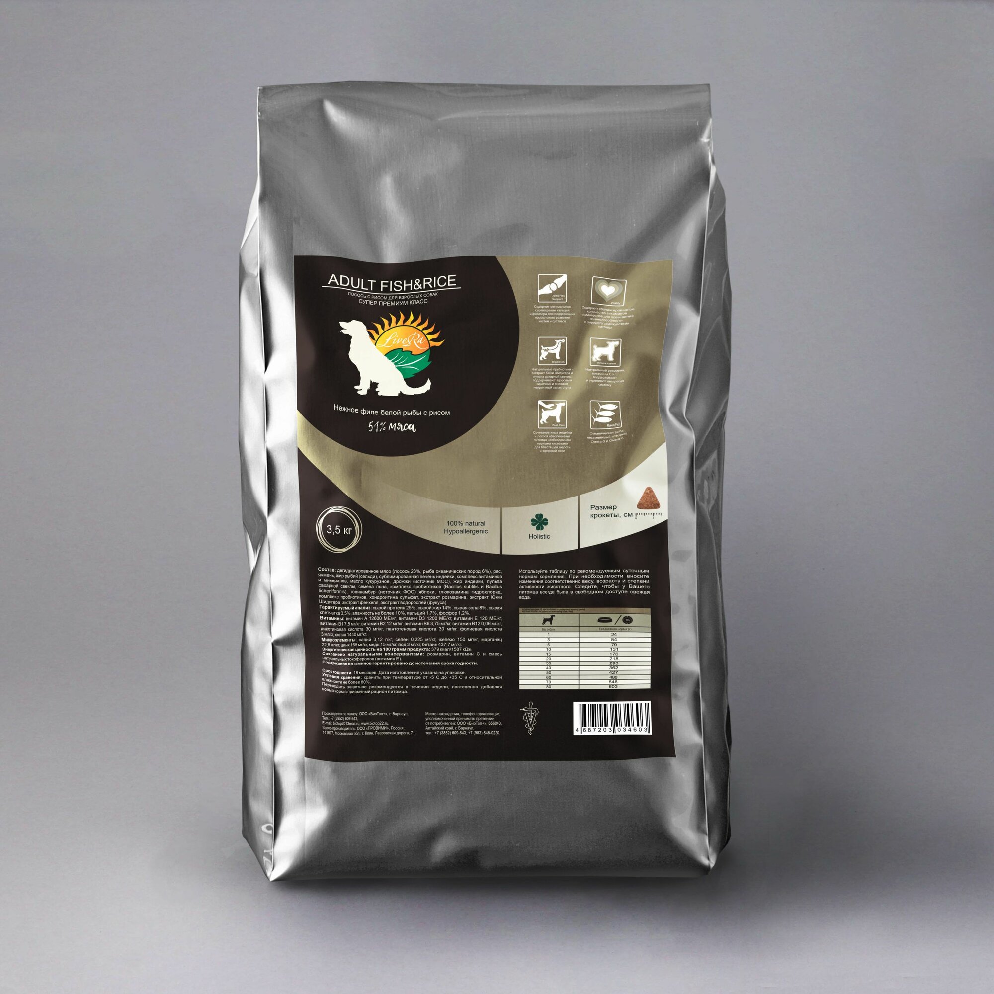 LiveRa Полнорационный сухой корм для взрослых собак Adult Fish & Rice, 3,5 кг, нежное филе белой рыбы с рисом