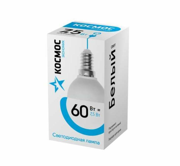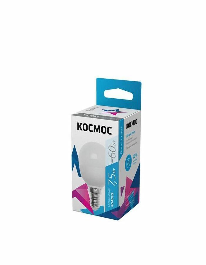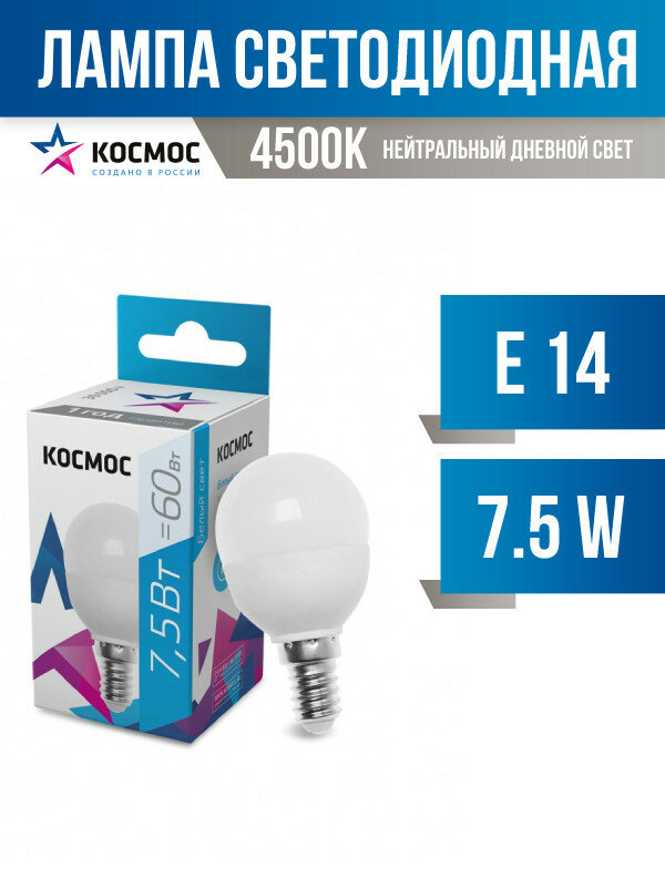 Светодиодная лампа Космос, 7.5 Вт, E14, 4500 K, шар, LED7.5wGL45E1445, нейтральный белый интересное: