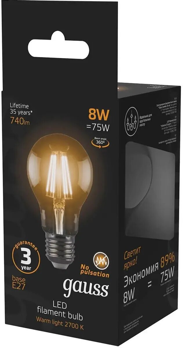 СохранитьFilament ЛОН A60 E27 8W(740lm) 2700K 2K прозр. 105x60 филамент (нитевидная) 102802108, Лампа светодиодная Gauss интересное: