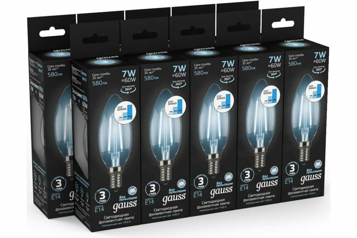 Светодиодная лампа Gauss LED Filament Свеча E14 7W 580lm 4100К step dimmable (пошаговое диммирование)