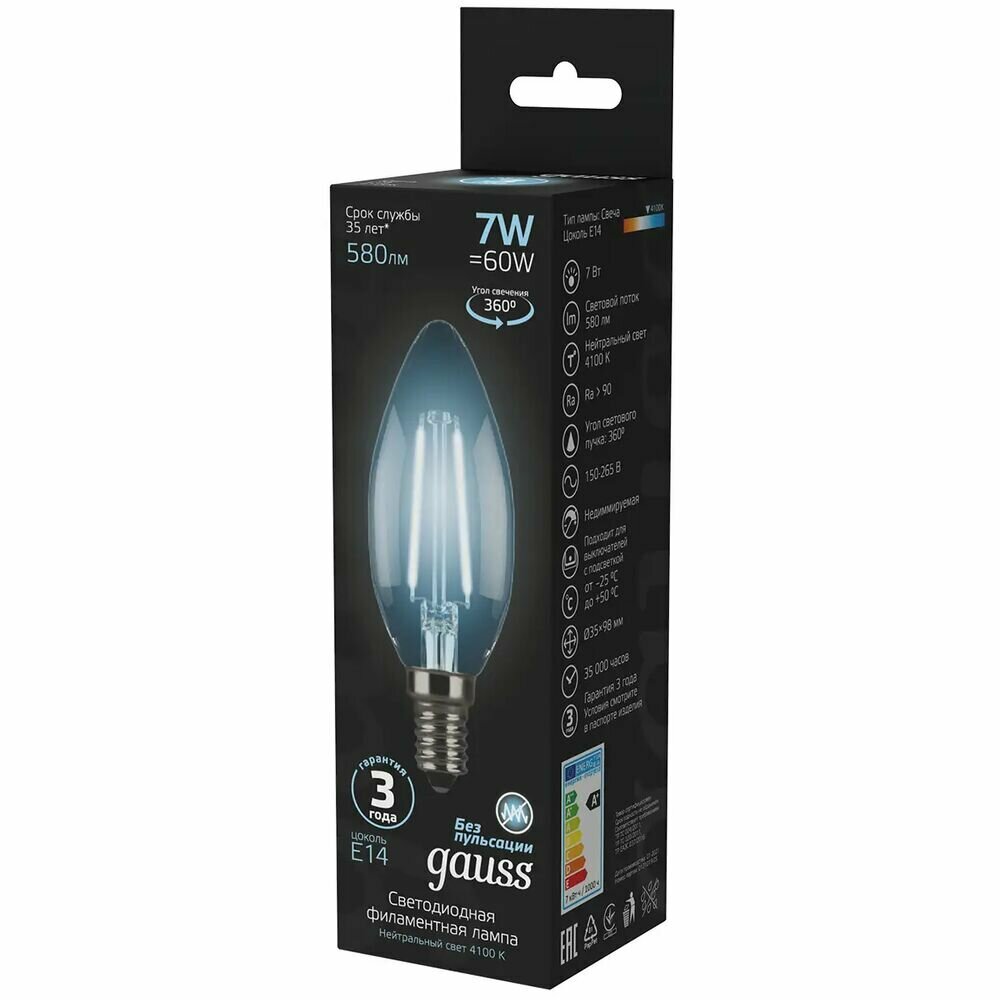 Gauss Лампа Filament Свеча 7W 580lm 4100К Е14 шаг. диммирование LED