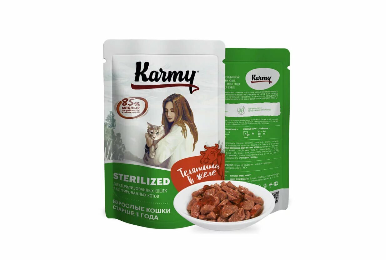 Корм Karmy Sterilized (в желе) для стерилизованных кошек, с телятиной, 80 г x 24 шт