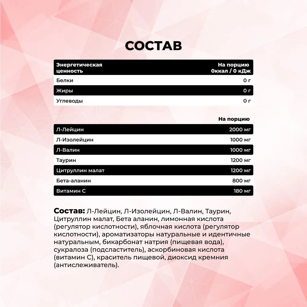 | Тип | аминокислотный комплекс / BCAA: валин / изолейцин / лейцин / таурин / цитруллин |