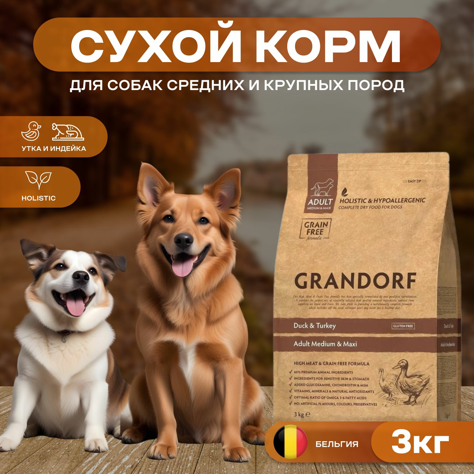 Корм сухой Грандорф для собак средних и крупных пород Утка с индейкой 3 кг