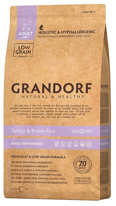 Гипоаллергенный низкозерновой сухой корм Grandorf для собак мелких пород Индейка с бурым рисом, (1 кг)