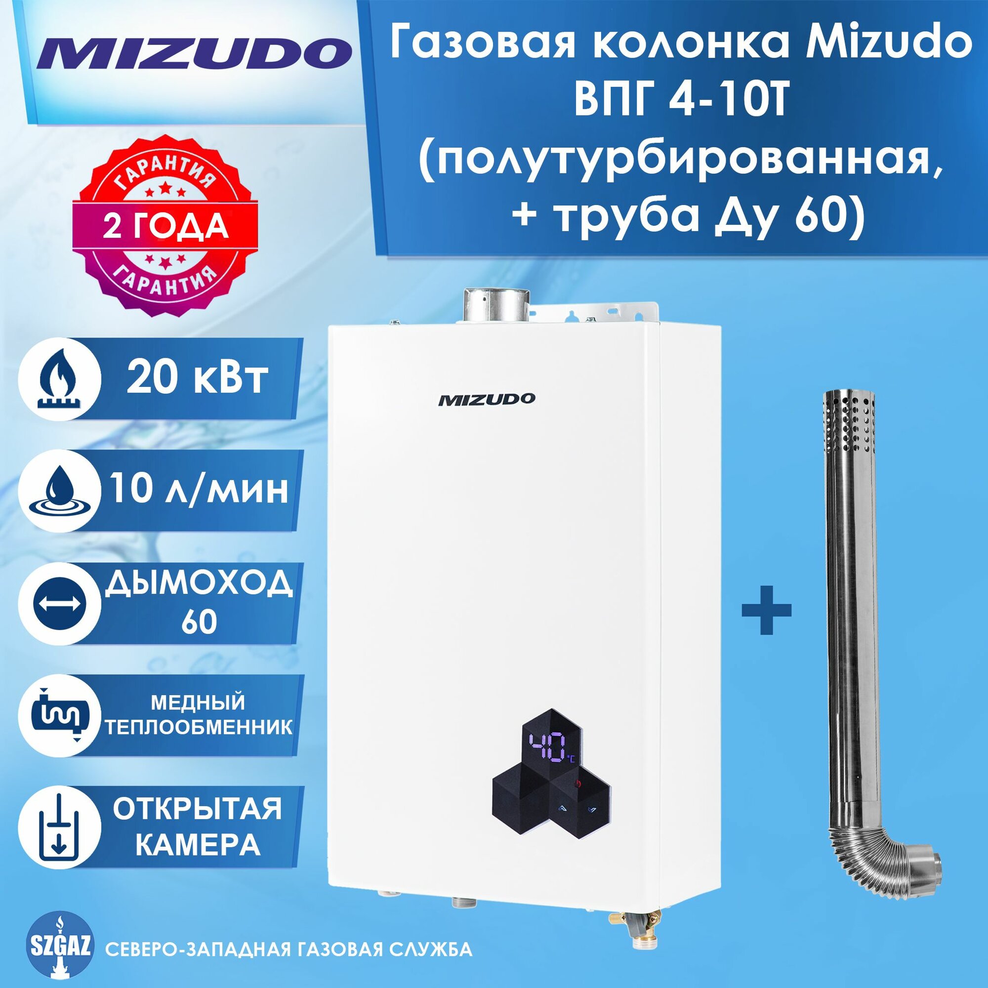 Купить Газовый проточный водонагреватель Mizudo ВПГ 4-10 Т , Газовая колонка ,труба 60х630 в комплпекте