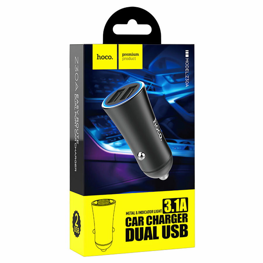 Автомобильная зарядка HOCO Z30A Easy, 2*USB, 3.1A, черный, индикатор