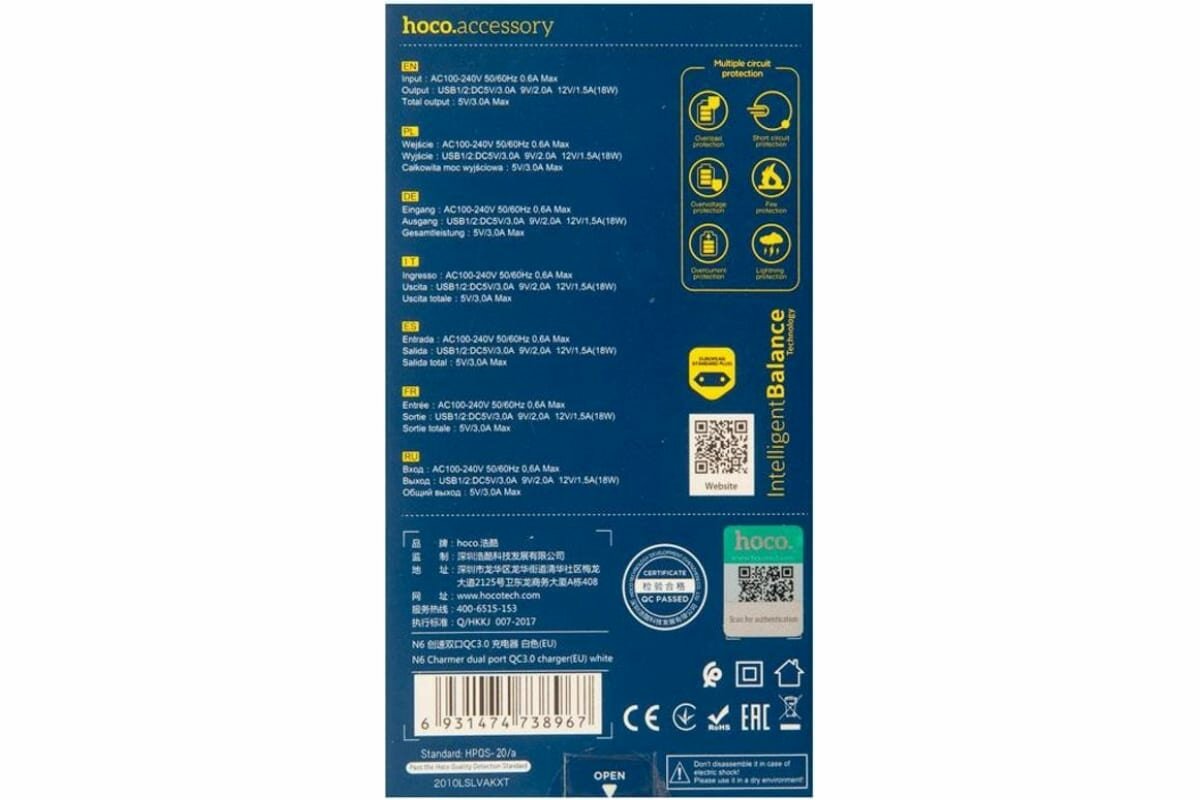 Блок питания (сетевой адаптер) HOCO N6 Charmer QC3.0, 18W, два порта USB, 5V, 3.0A, черный