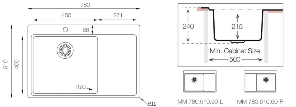 Кухонная мойка TopZero MM780.510.60.GT10K L, нержавеющая сталь