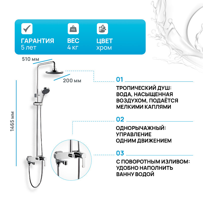| Дополнительная информация | высота стойки для душа: 1450 мм; диаметр душевой лейки: 100 мм; диаметр верхнего душа: 180 мм |