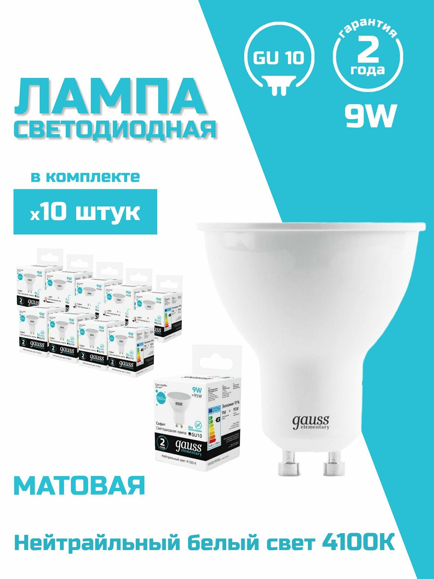(10 шт) Лампа Gauss Elementary MR16 9W 660lm 4100К GU10 LED 1/10/100