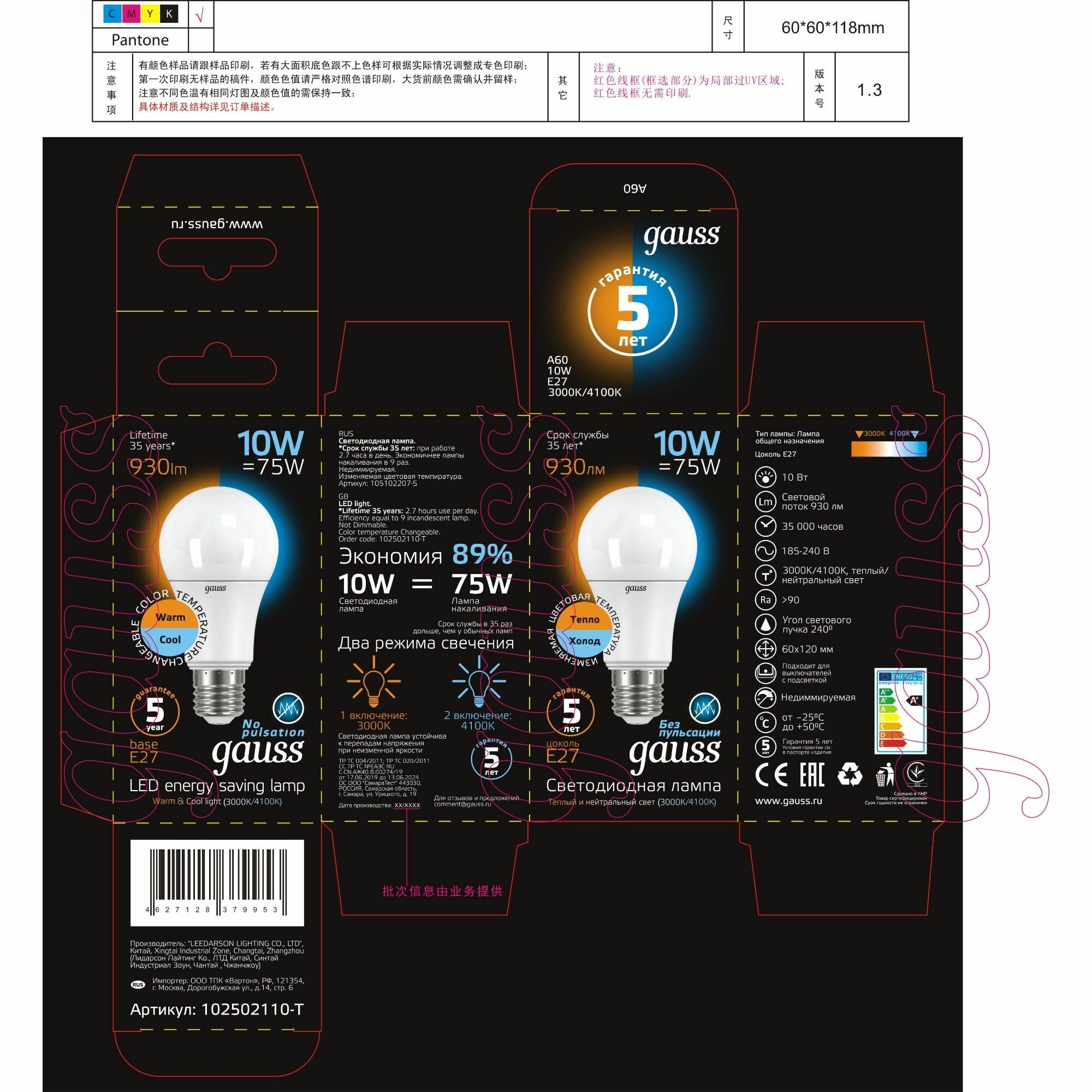 Лампа светодиодная 2 режима Gauss 102502110-T LED A60 10W E27 2700K/4100K