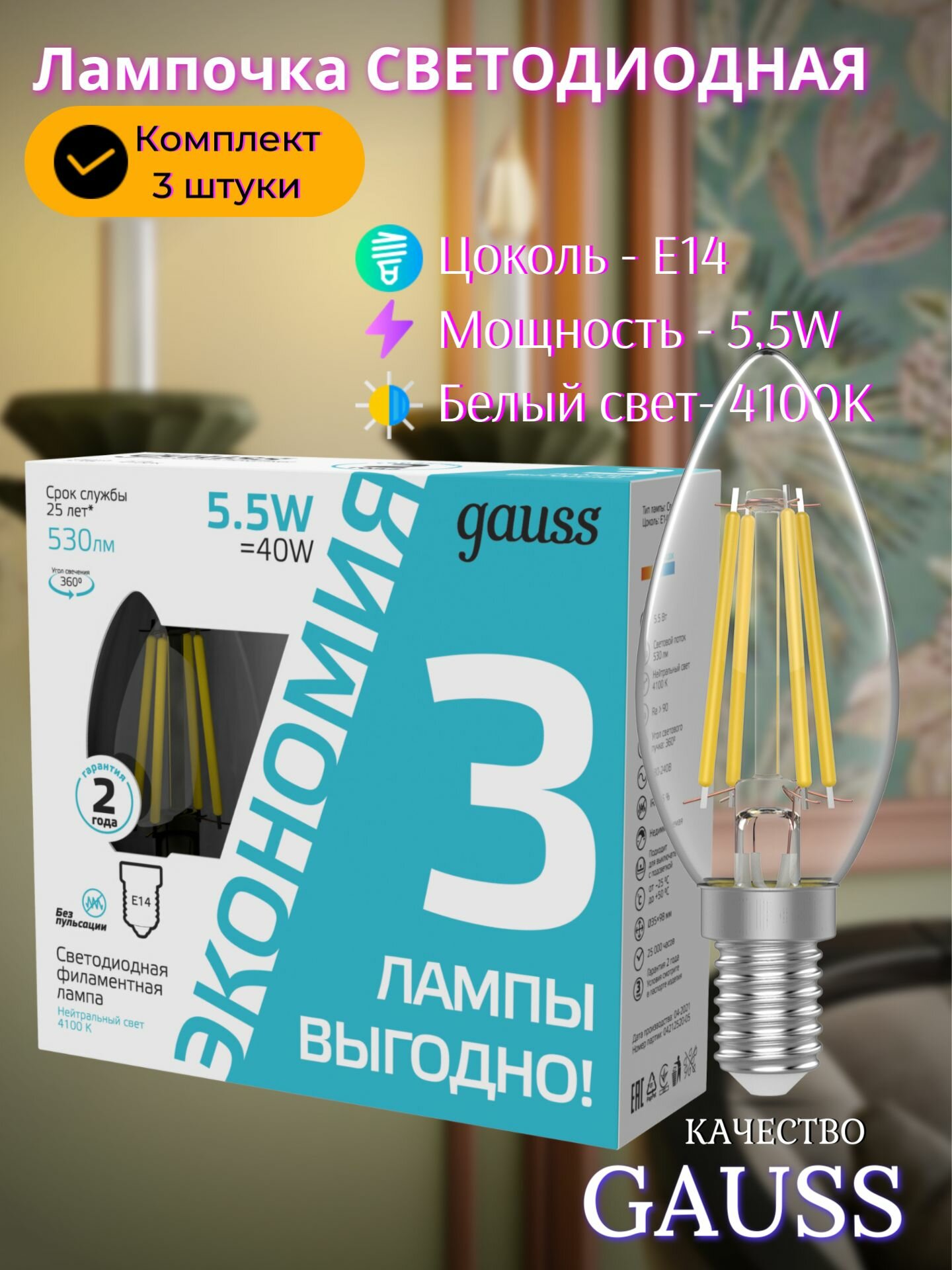 Купить Лампочка светодиодная Е14 Свеча 5,5W Комплект 3 шт. нейтр белый 4100К Gauss Filament