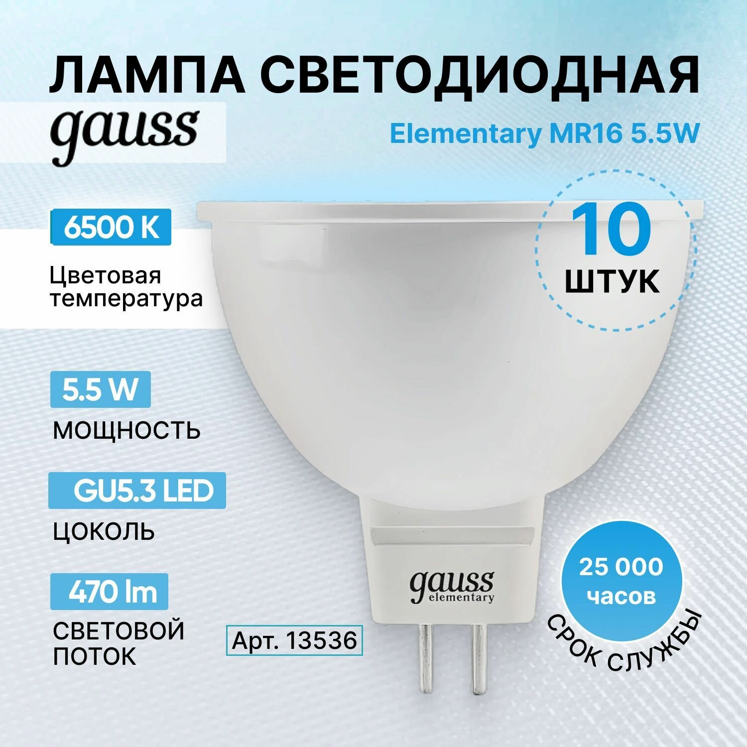(10 шт) Лампа Gauss Elementary MR16 5.5W 470lm 6500К GU5.3 LED 1/10/100