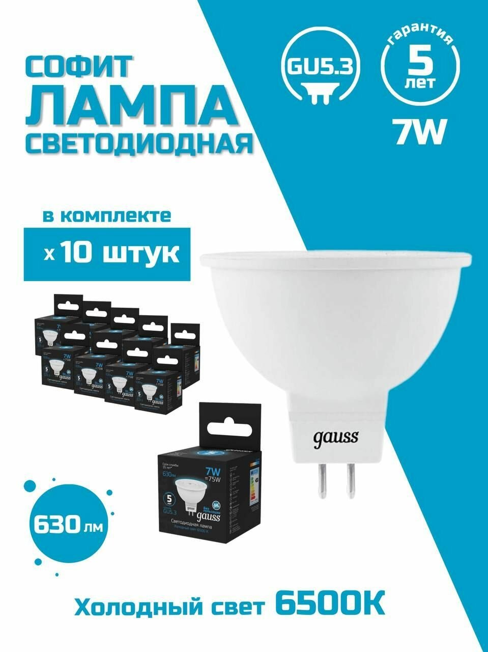 Упаковка светодиодных ламп 10 шт. gauss 101505307, GU5.3, MR16, 7 Вт, 6500 К
