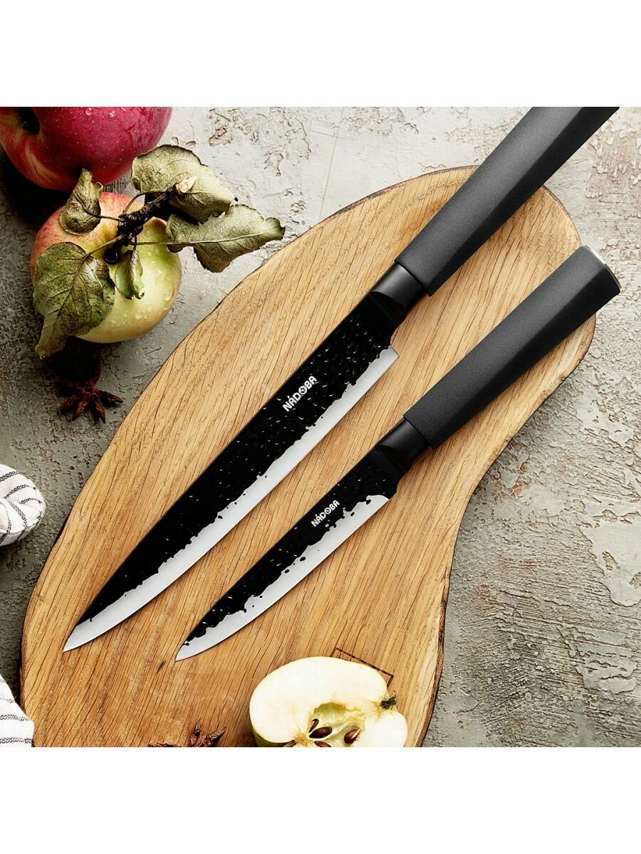 | Минусы: | Собраны небрежно, ржавеют, внешний вид - этот не ковка, это черная краска и имитация вмятин. Лезвия немного перекалены, из-за этого быстро выкрашиваются, после покупки и пары дней использования пришлось ножи переточить. Краска начала облазить через несколько месяцев использования, из-за дизайна это не заметно, но я-то вижу) В общем со скидкой и если хочется необычного дизайна, брать можно. Но в целом рекомендовать не могу, а за полную цену вообще того не стоит. |