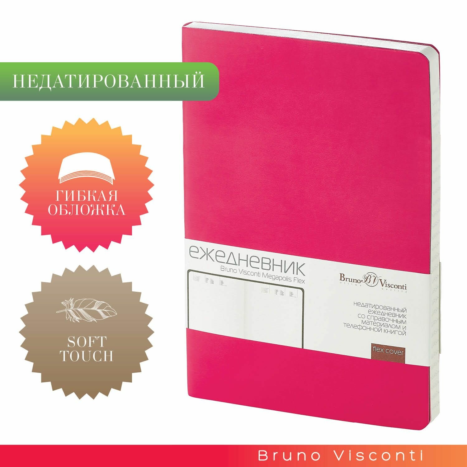 Ежедневник недатированный Bruno Visconti "MEGAPOLIS FLEX" гибкий, Soft touch, фуксия А5, Арт. 3-531/09