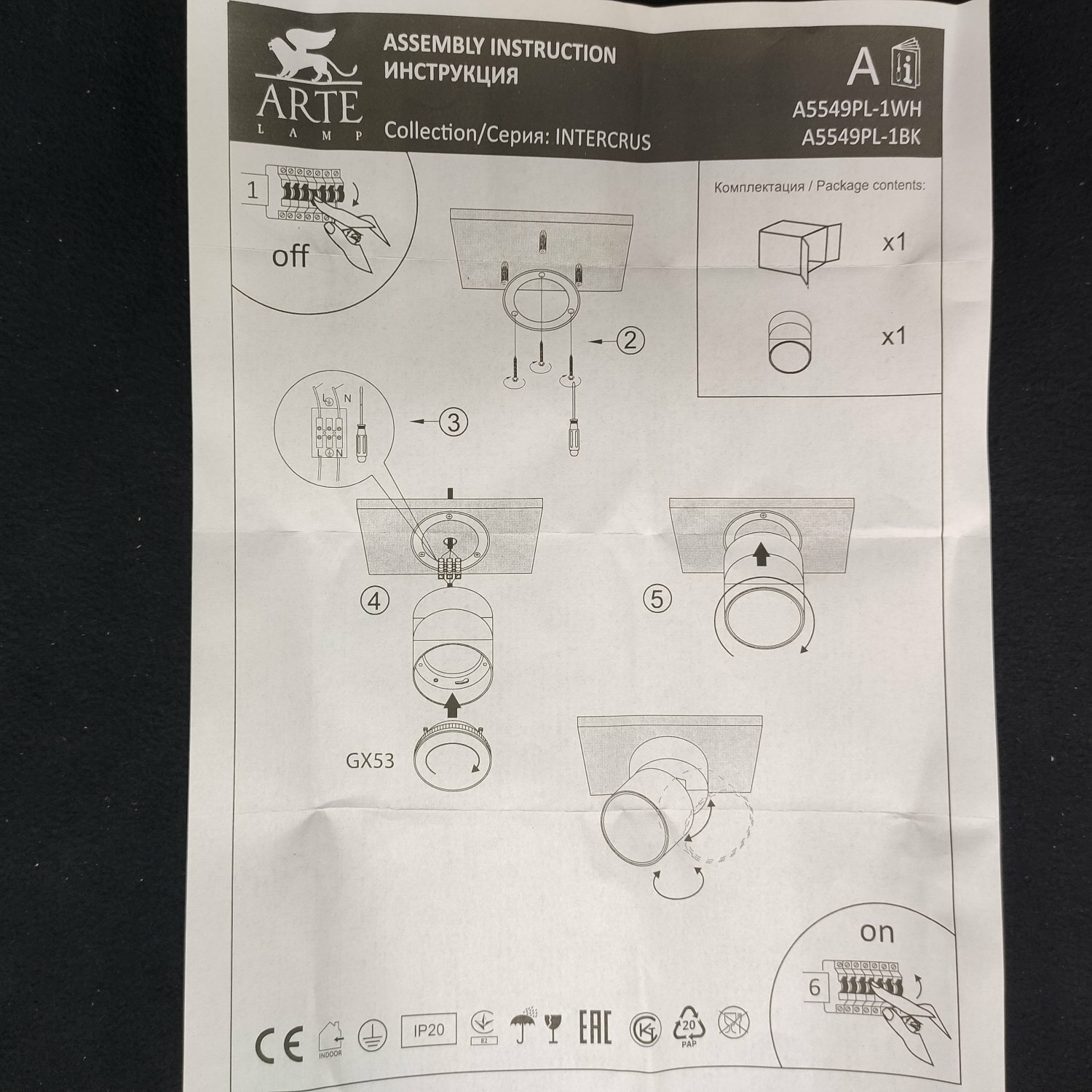 Накладной светильник Arte Lamp Intercrus A5543PL-1BK, GX53, кол-во ламп:1шт., Черный