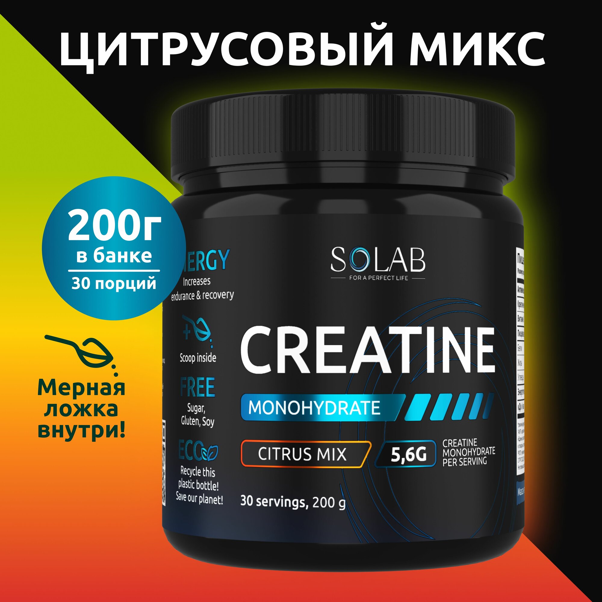 SOLAB Креатин моногидрат порошок 30 порций вкус апельсин 200 гр спортивное функциональное питание