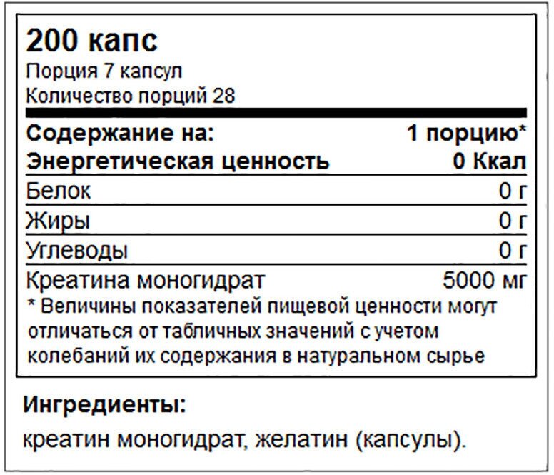 | Дополнительная информация | размер порции: 7 шт.; рекомендации по применению: первый вариант состоит из двух этапов: первую неделю необходимо принимать по 5 грамм креатина 4-5 раз в день, далее следует принимать по 5 грамм 1 раз в день, для поддержания концентрации; второй вариант: прием 5 грамм креатина 1 раз в день в течение, минимум, 30 дней; состав: креатин моногидрат, желатин |