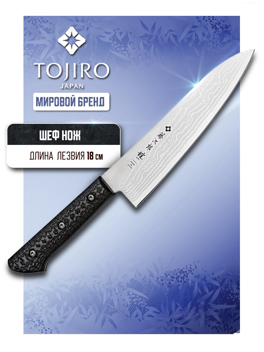 Купить Нож Кухонный Поварской шеф TOJIRO (F-1352), длина лезвия 18,0 см, дамасская сталь VG-10, 37 слоев, рукоять микарта, Япония