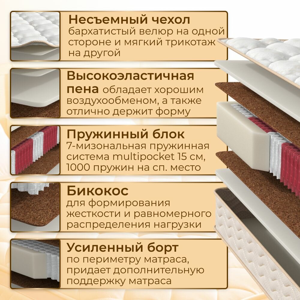 Жаркий из-за толстого слоя синтепона Очень жёсткий из-за большого количества пружин и кокосовой койры Не ортопедичный/не анатомичный, поясница, локти, колени висят в воздухе Для комфортного сна нужен толстый наматрасник из латекса/ппу/memory foam Очень тяжёлый, переворачивать одному сложно |
