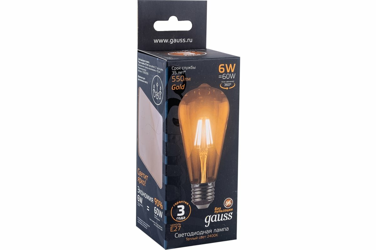 (1 шт.) Светодиодная лампочка Gauss Filament Цилиндр ST64 E27 6W(550lm) 2400K 2K 143x64 золотая, нитевидная, прозр. 102802006 Теплый белый. Цоколь E27